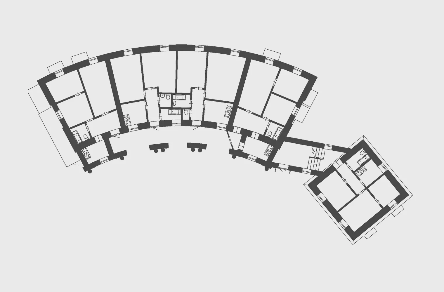В составе усадьбы два служебных корпуса-циркумференции (строения 7 и 8) — редкий для Москвы тип дворовых построек.